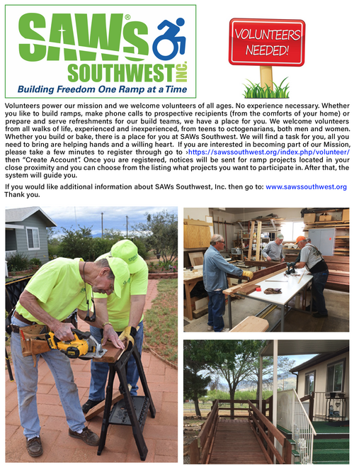 We have a wide variety of groups and activities to serve the community and our congregation. Our Food Pantry, SAWs ramp-building team, GriefShare and Stephen Ministry, our Women’s groups and our Men’s Group along with our Outreach Team are actively involved in serving the community and spreading the love of Jesus. We host Vacation Bible School and groups such as Sierra Vista Sings.
